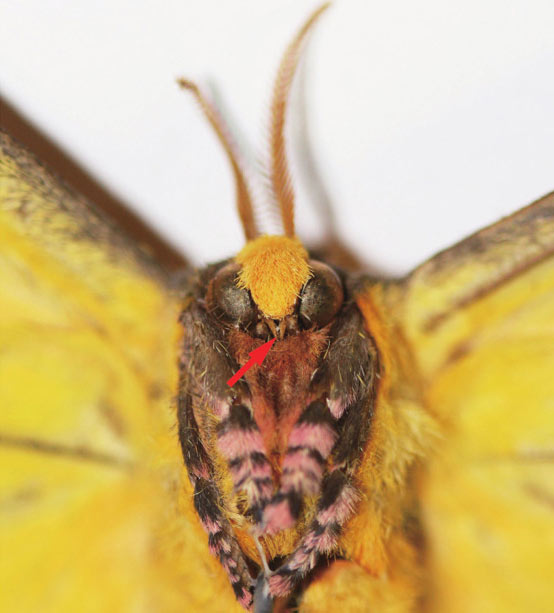 蚕蛾退化的口器(箭头所指)