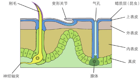 刚毛:刚毛是许多昆虫重要的感觉器官,通常由毛原细胞、膜原细胞、感觉细胞组成一套感觉器。刚毛形态有许多变化,在苍蝇体表称作鬃毛,在蛾子体表刚毛特化成了鳞片,象鼻虫体表的鳞片也是刚毛变成的。