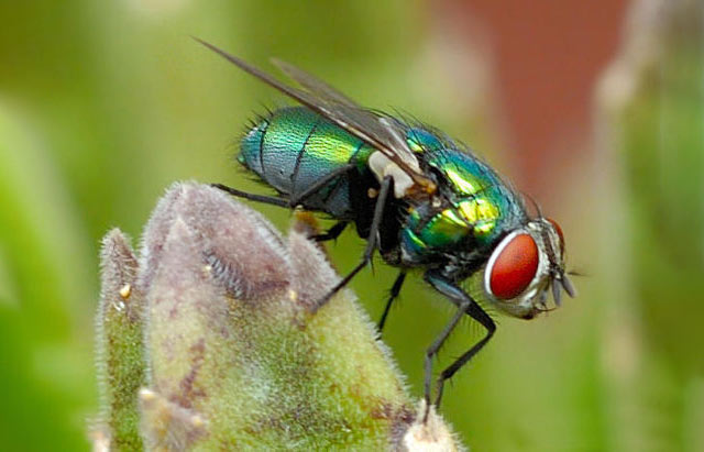 金蝇(Lucili caecar Linnaeus)又叫青蝇,体长九毫米左右,体现金绿色,脸是黑色,而有银白色的光辉,翅透明,翅脉淡黄色,前缘带黑褐色,脚黑色,但带着比身子更鲜明的金光。它们常在野外,少进屋内,虽然有时也光临厕所,但不是从厕所中发育的。
