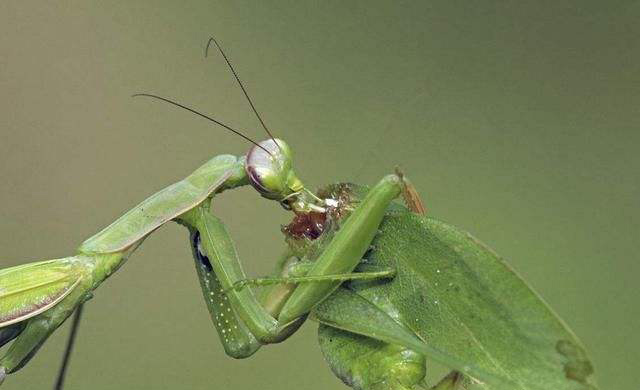 法布尔曾有一只已受精的雌螳螂,在饲育笼里吃了七只雄螳螂的记载。我们如把几对雌雄螳螂,关在一笼,在它们交尾时,雌的就趁雄的在愉快地抱着时,不管头咧颈咧,除生殖器外,全吃个精光。