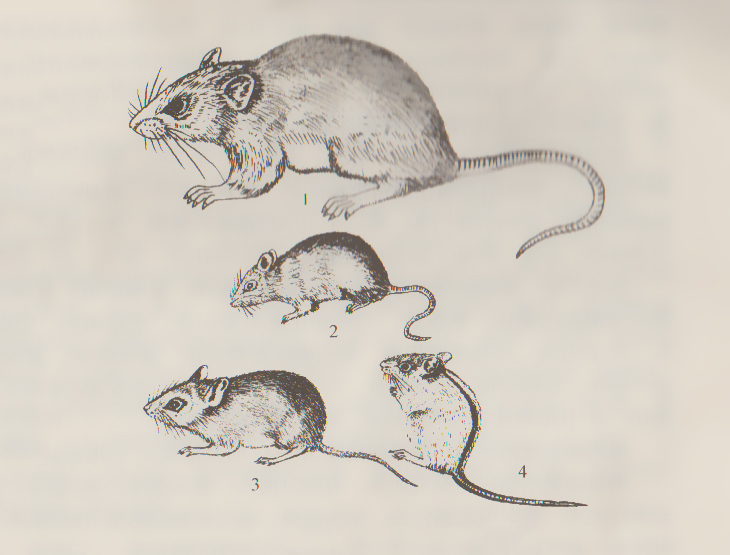 图一:住宅 仓储区常见鼠类 1.福家鼠 2.黄胸鼠 3.小家鼠 4.黑线姬鼠 (徐国淦仿中国农作物病虫害)