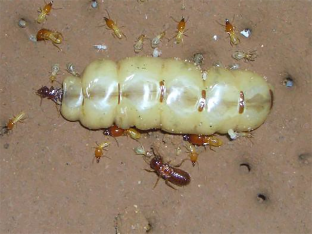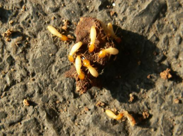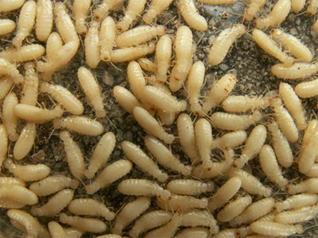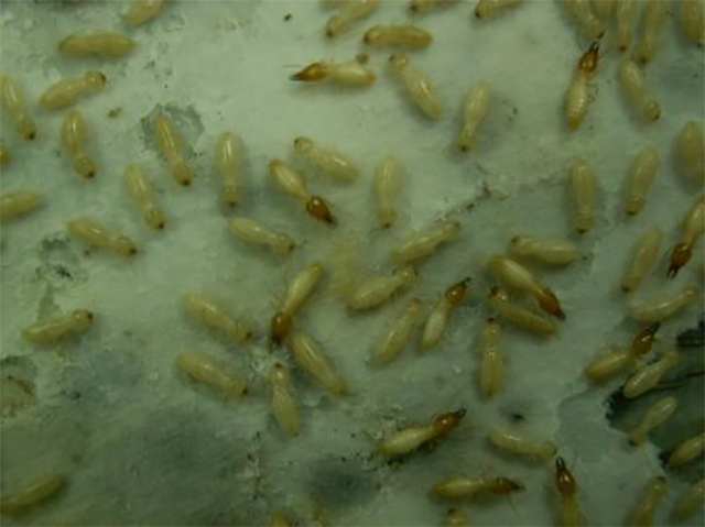 台湾乳白蚁工蚁灰白色,但因取食的关系,其腹部常可见 淡红色或淡黑色的条带(图 1-4)。在引诱箱、木结构或树干危 害部位等处捕获的工蚁,通常为成熟工蚁,个体大小基本一致。