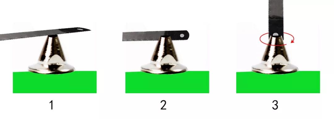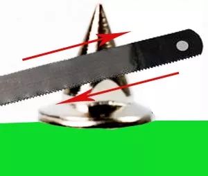 解决方法二:用钢制锯条把钉尖部位锯平,使其形成一个小平面。再向垂直于小平面的方向锯出一个卡槽,制造出一个“螺丝钉帽”的构造,利用螺丝刀或锯条直接进行拧动。