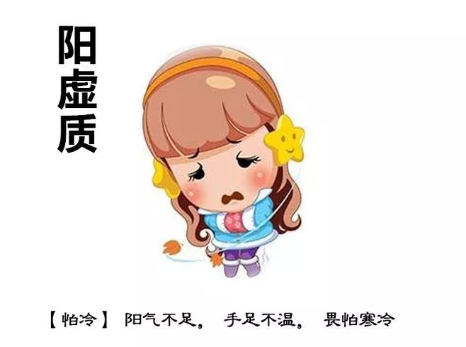 ③常见表现:主项为:平素畏冷,手足不温,喜热饮食,精神不振,睡眠偏多,舌淡胖嫩边有齿痕,苔润,脉象沉迟。副项为:面色觥白,目胞晦黯,口唇色淡,毛发易落,易出汗,大便溏薄,小便清长。
