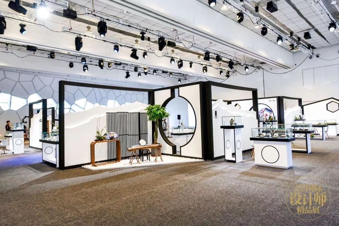 展览现场以水墨黑、长城灰、玉脂白为主色调,打造新中式主题园林,搭配抽象化的屏风、水墨画与中式家具,以点线面的现代几何型布局,诠释新中式生活美学。