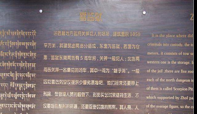 下面重点介绍雪监狱,是以前专门用来审问和关押犯人的地方,雪监狱,占地5万平方米,为旧西藏名声在外的拉萨两大监狱之一。总面积1050平方米,其建筑由两部分组成,东面为监狱,西面为仓库,北侧两间是关押重犯的地牢,其中一间就是恶名昭著的“蝎子洞”。犯人投入洞中往往被成群的蝎子活活咬死。