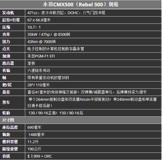 CMX500的售价格比CBR500R帅气的CB500F贵,为什么会这样呢?据本田称,这是由于在新车架,仪表和许多细节上需要重新投资。考虑到市场上的其他选择,它的价格还算相当不错。