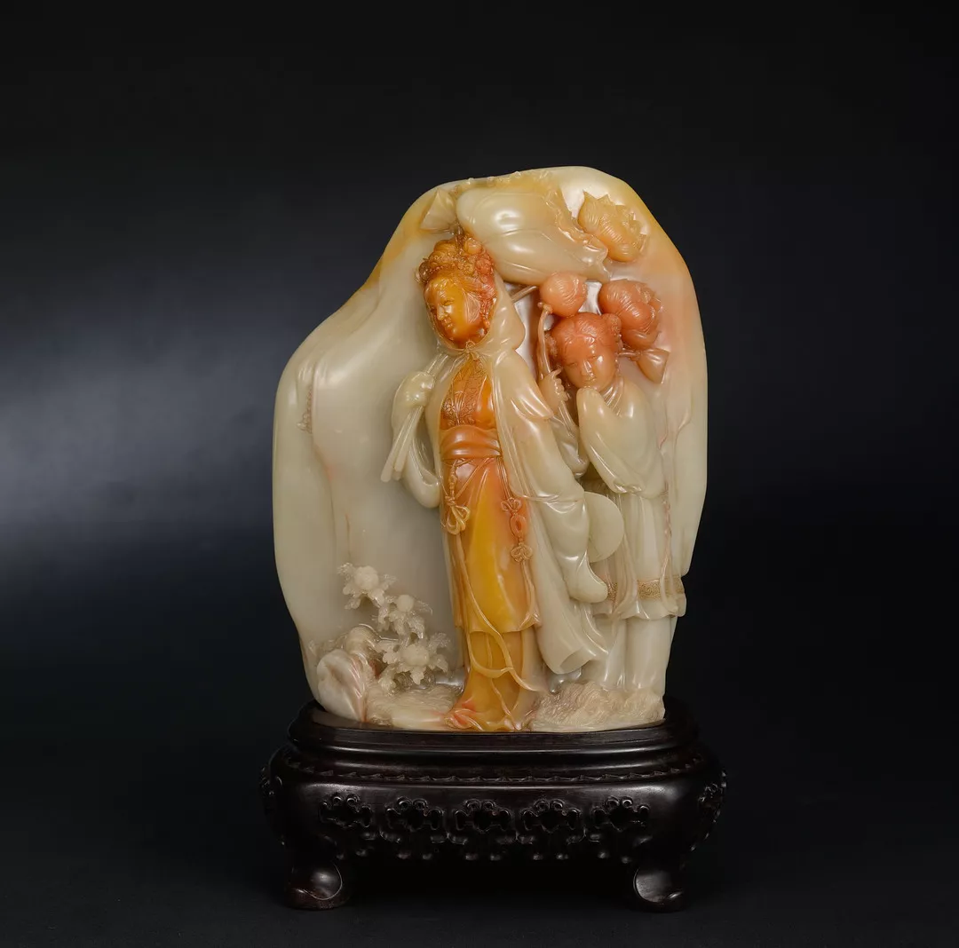 作品取材银裹金奇降石,然而在创作过程中,作者发现身体部位的石料仅有一层滇薄的俏色,随机应变之下,他设计了人物的披风,以层叠的衣袂修饰了那一袭原本的黄衣,反倒显得清新脱俗、清丽可人,再现了夏日采荷的情趣。