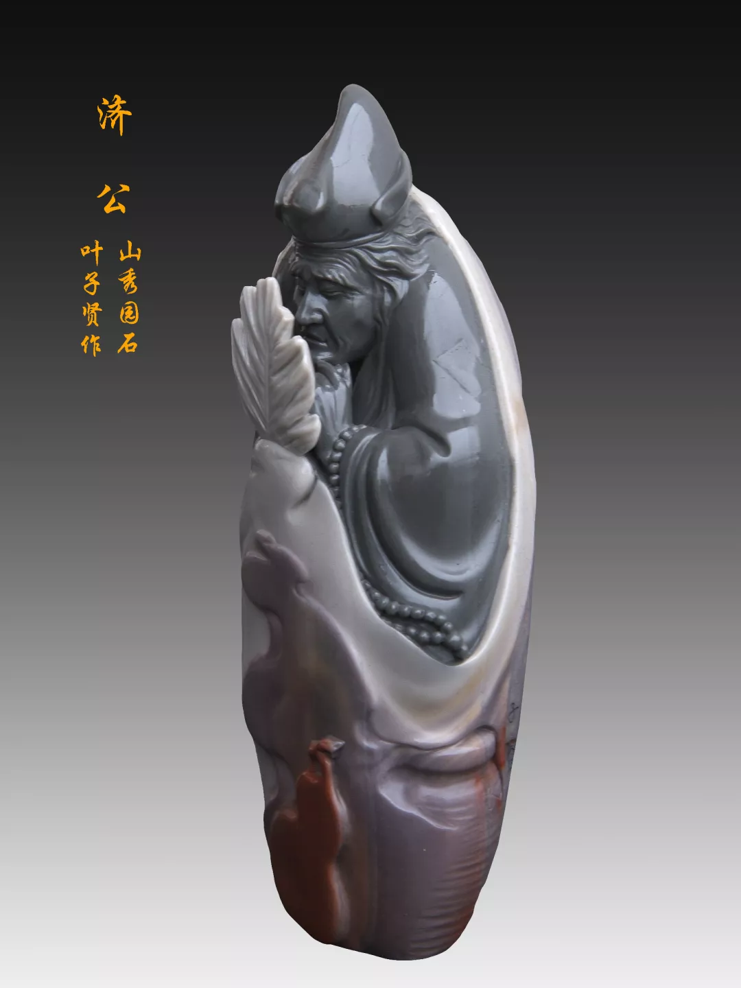 这件作品的绝妙之处在于济公所持扇面与脸部基本保持平行,这不仅雕刻难度大,而且颇废匠心,在扇面后面,那一支微翘的手指,细如牙签,却惟妙惟肖;手捻的佛珠细如米粒,却皆粒粒可数。作者将济公这位破帽、破扇破鞋、垢衣、貌似疯、实则学识渊博、行善积德的得道高僧形象雕刻得鲜活灵动、跃然石上。