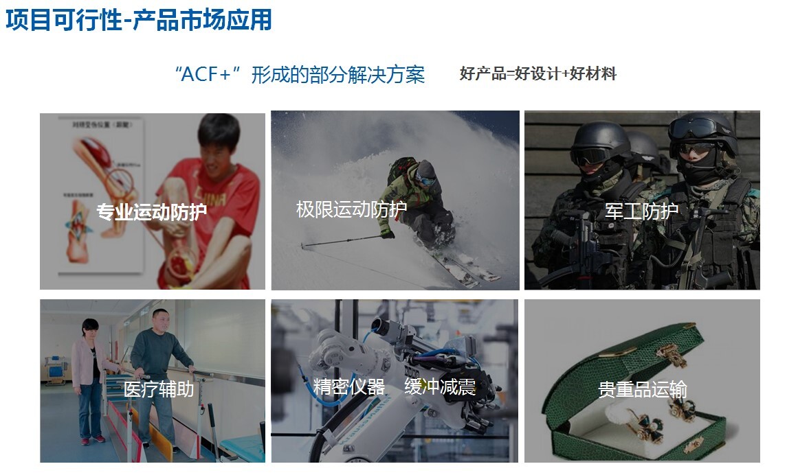 还有能吸收90%以上冲击力的ACF极限缓冲材料,ACF极限缓冲材料是ACF实验室是基于仿生学的原理,模仿人的软骨组织,在仿生、力学、化学、数学等跨学科的基础上,历经12000多次实验研发出来的三维超微结构的人工软骨仿生超材料,能在瞬间把冲击能转换为热能,最大限度地保护人体与贵重物品不受伤害。
