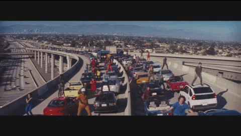 这场戏花费了两天时间正式拍摄,而且还专门封了洛杉矶一条公路。场景调度要从人物近景一路拍到密集的车流全景,摄制组练习了多次从斯坦尼康到摇臂的无缝对接,前后拍摄了近100次才达到最完美的效果。