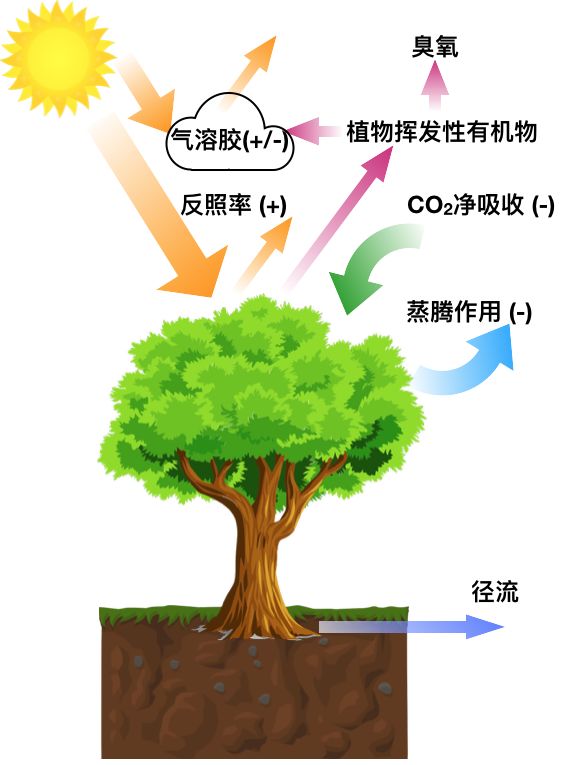 图1.森林的主要生物地球物理作用和生物地球化学作用。加号表示该作用会提高地表温度。森林的反照率比裸土或者草地要低,因此会反射更少的太阳光(也就是吸收更多太阳光),导致地面温度升高。森林通过吸收二氧化碳和蒸腾作用降低地面温度。此外森林通过释放植物挥发性有机物影响气溶胶的形成。气溶胶能影响云的形成,从而可能反射更多的太阳光,但同时气溶胶也可能因为吸收太阳光而提高空气温度。因此,气溶胶对气候变化的影响较为复杂。植物挥发性有机物能导致更多的臭氧的产生。此外,最近一些研究表明蒸腾作用会影响地表径流,从而导致河流水量减少。
