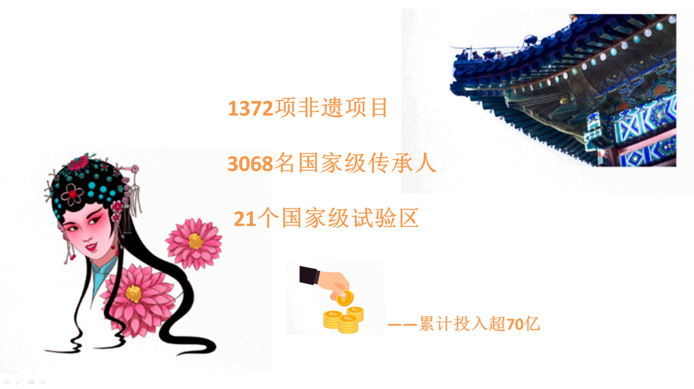 文化和旅游部非物质文化遗产司副司长胡雁10月17日下午在出席第七届中国成都国际非物质文化遗产节相关活动时介绍,目前,国务院公布了四批1372项国家级非遗代表性项目,文化和旅游部认定了五批3068名国家级代表性传承人,批准设立了21个国家级文化生态保护试验区;各省、区、市认定了15777项省级代表性项目和16432名省级代表性传承人。