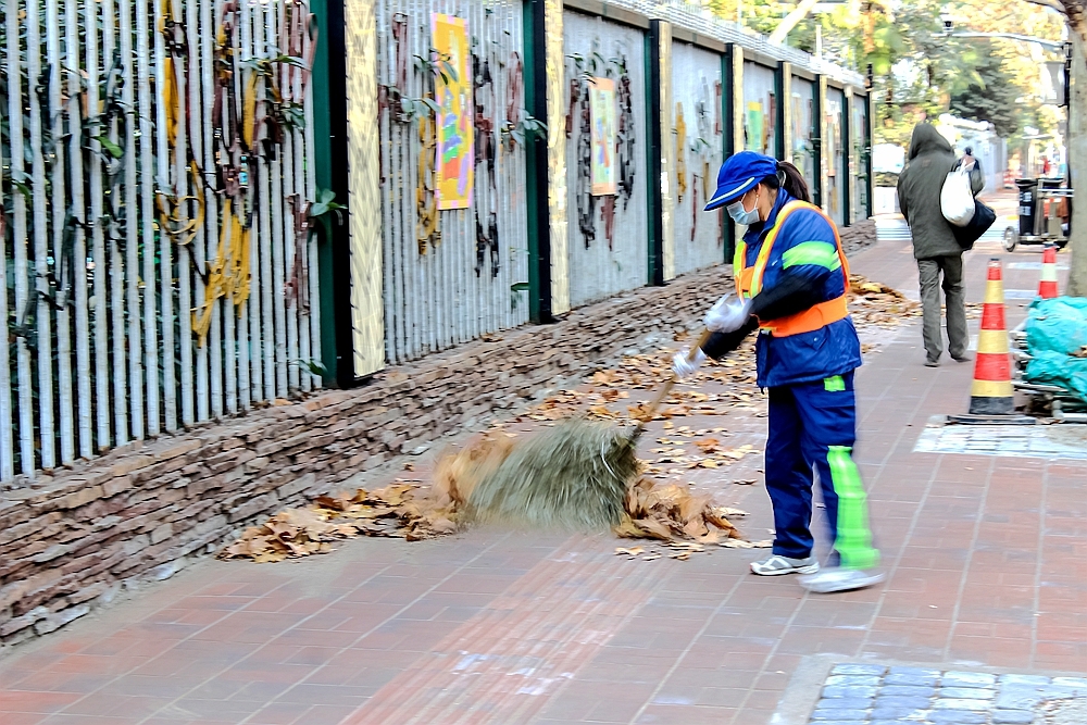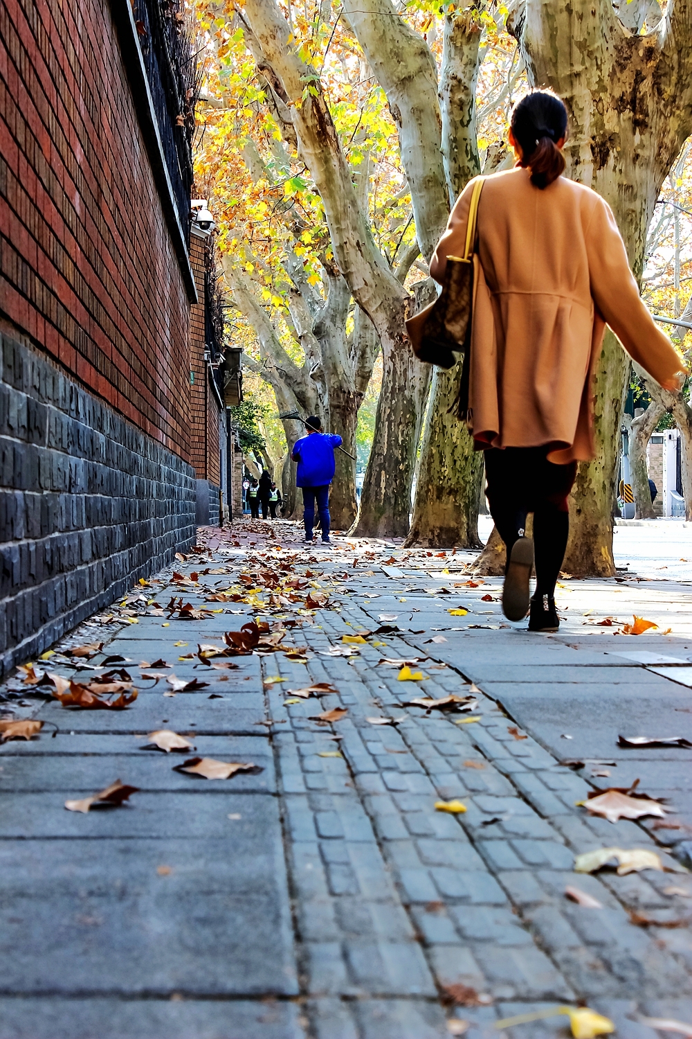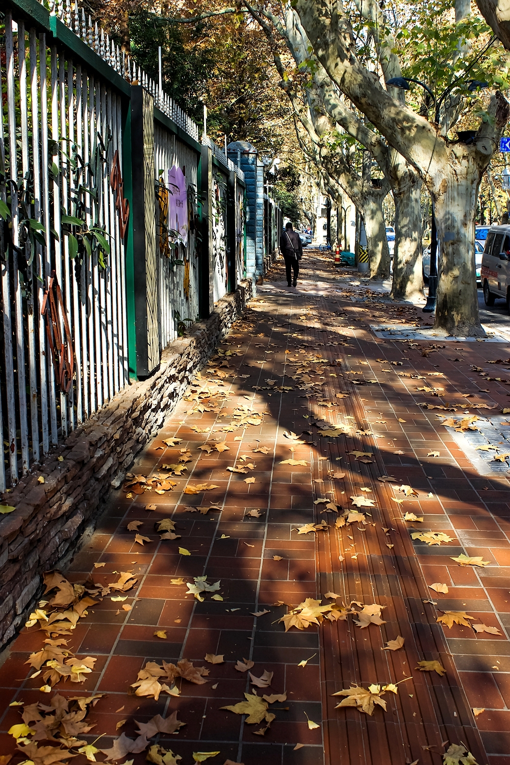 衡山路上全是梧桐树,秋风扫落了一片又一片的树叶,落叶大而蓬松,色泽偏暗黄。
