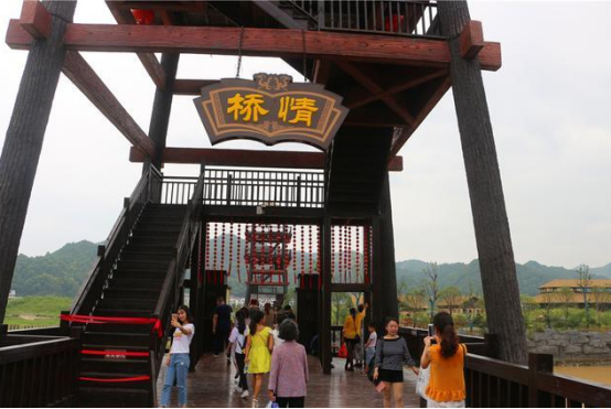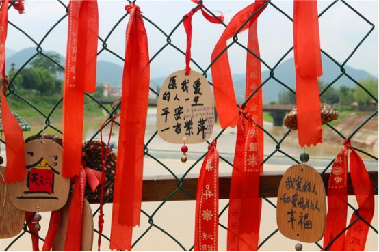 走过情桥,感受武王与周宁宁千年的情缘,木质的长桥上挂满了红色的祈福物,寄托情侣们美好的期许
