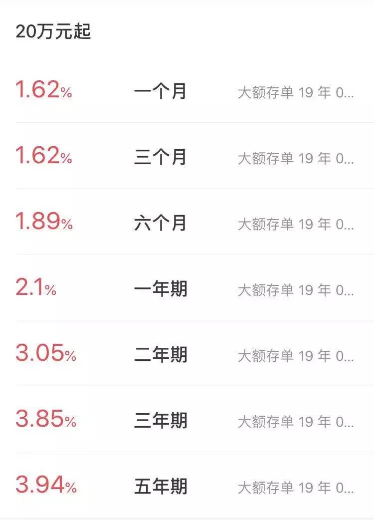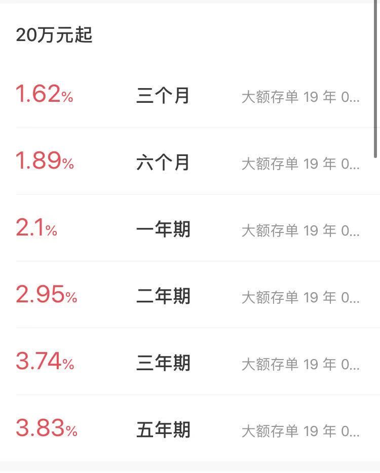从截图中可以看到,20万起存门槛,按月付息的大额存单,一年期利率2.1%,二年期利率2.95%,三年期利率3.74%,五年期利率3.83%。