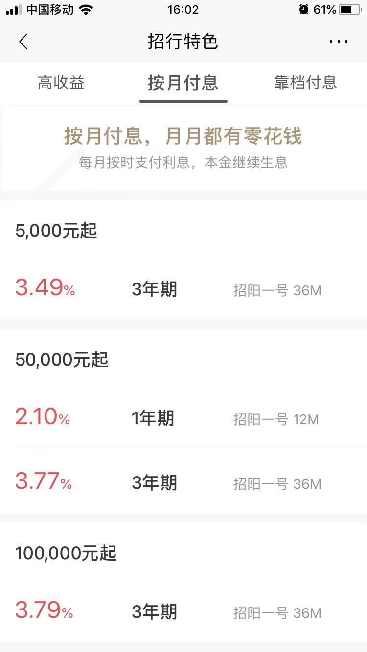 现在很多银行推出了大额存款按月付息的储蓄类产品,以招行银行的特色储蓄存款类产品为例,同样也有到期付息和按月付息两种不同的方式,还有起投金额门槛也不相同;