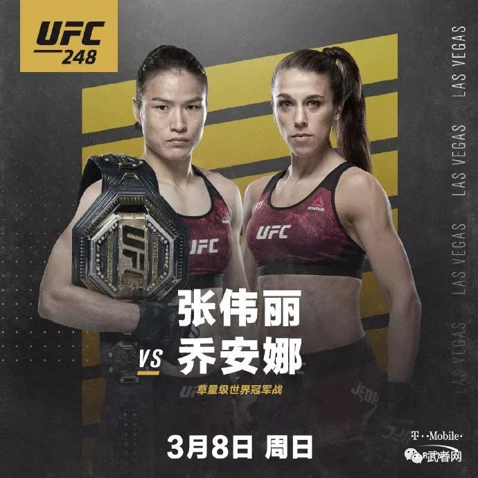 本次UFC 248官方确定了一场女子草量级冠军争霸赛,现任冠军张伟丽(20-1,10 K,7 S)对阵挑战者前冠军乔安娜·耶德尔泽西克(16-3,4 K,1 S)。