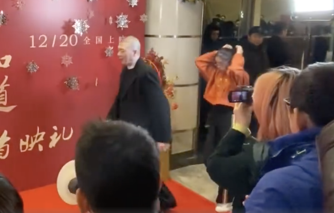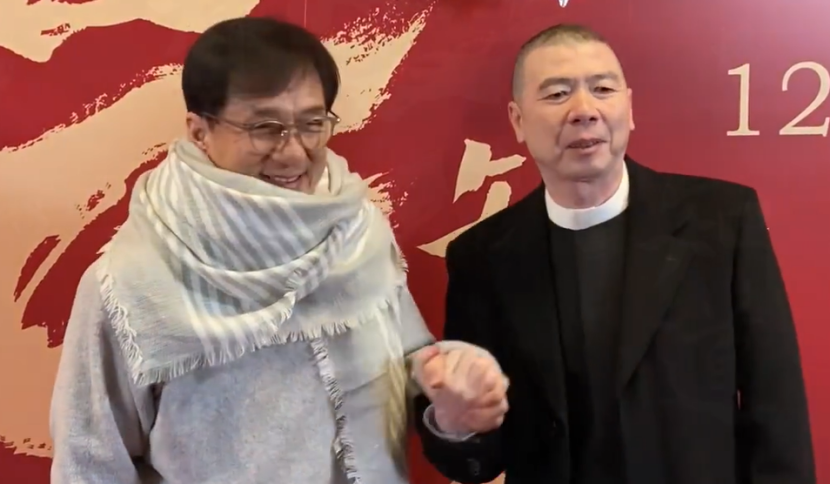 成龙大哥也不远千里来参加首映会,大哥当天一身灰色休闲服,还围了一条厚重的围巾,十分保暖,看来再冷也要来给好友捧场,合照时冯小刚十分激动地握住了成龙的手。