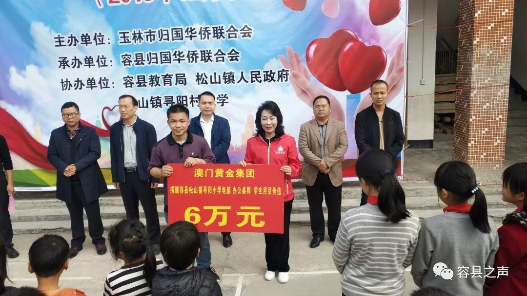 12月15-16日,适逢澳门回归祖国20周年喜庆日子,澳门归侨总会副会长、印尼归侨协会会长、澳门黄金集团营运总裁卢秀梅女士,亲率11位澳门黄金集团的同胞莅临侨乡容县,开展扶贫助学活动,为松山镇寻阳小学捐赠价值6万多元的电脑、办公桌椅和学生用品,并深入2户贫困学生家庭,送去慰问金1000元和急需的被服等生活用品。广西侨联副主席、玉林市侨联主席杨志光,副主席陈毅南,容县县委常委、统战部部长刘城亮等领导出席了在寻阳小学举行的物资捐赠仪式并陪同慰问。