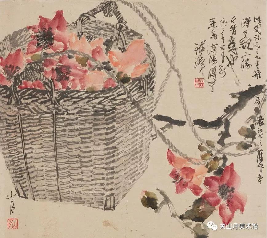 (一)岭南余韵 20世纪40年代,徐悲鸿就称关山月为“红棉巨榕乡人”,而他晚年也常用“红棉巨榕乡人”闲章,以示不忘故土乡情。红棉和巨榕也是关氏喜爱表现的岭南乡土题材,此外还有芭蕉、丹荔、睡莲等等。自19世纪晚期,岭南本土画家居巢、居廉兄弟更以写生、写实为旨趣,致力于岭南本土花木的描绘,大大地拓宽了花鸟画的表现题材。居氏所创撞水撞粉之法,作为独特的技法语言,促成岭南地区鲜明的画风。岭南三杰高剑父、高奇峰、陈树人等同出居氏门下,传承表现岭南花木的传统和撞水撞粉的技法,这些都成为关山月表现岭南花木题材的重要参照。关山月笔下的岭南花木,因其山水画家的视角而显得别具一格,既有笔墨趣味,又不失物象形态的生动,一定程度上也显示了画家的对于此一主题的传承与突破。