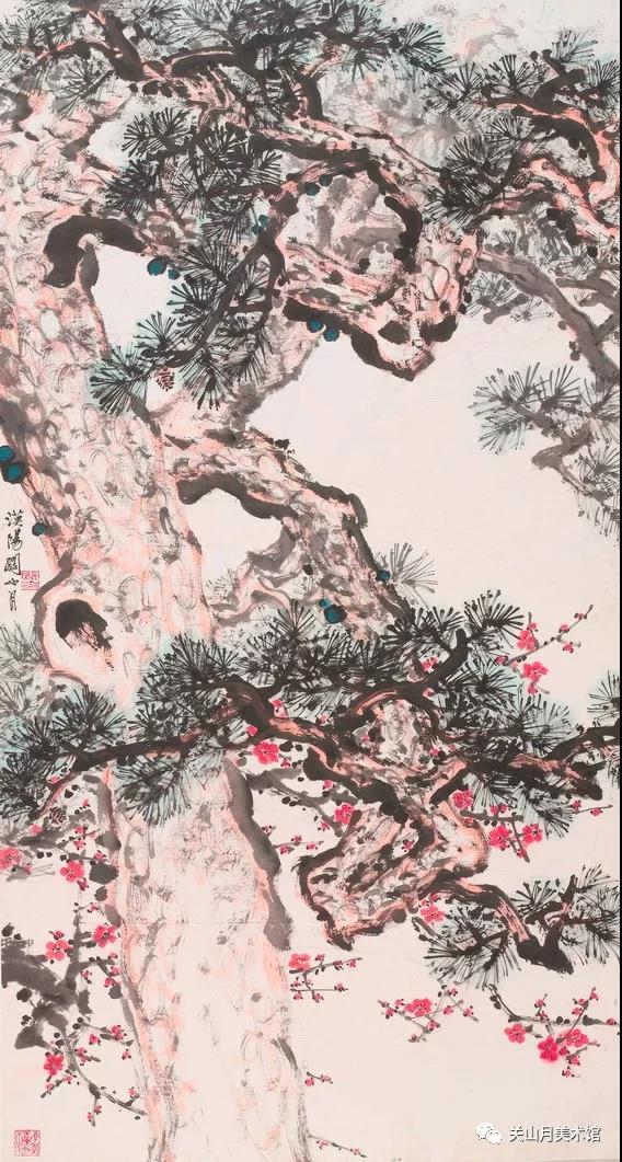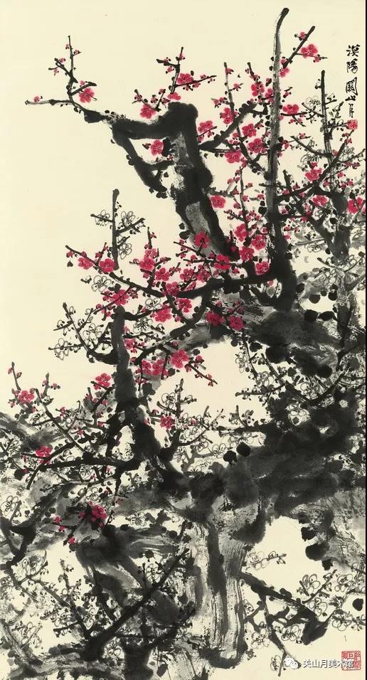 (二)关梅迎春 关氏一反古人画梅遗意,其智慧的源泉不仅来自毛泽东的革命哲学的启发,更重要的是,作为一个山水画家,他充分地发挥了善于营造整体氛围的艺术语言技巧。奇险的构图,雄健的笔力,并且,所有这一切都倾向于在整体上追求咄咄逼人的气势和疾速运动的节奏,构成了关氏画梅的风格特征。80年代以后,关氏梅花进入一种圆融化境,他变得更加挥洒自如,将个人笔墨气质和作为山水画家的视野,融入梅花的创作之中。关氏以迅雷奔骤的取势和狞厉恣肆的笔法,画出了一个饱经苍桑的中国艺术家胸中的郁勃之气。