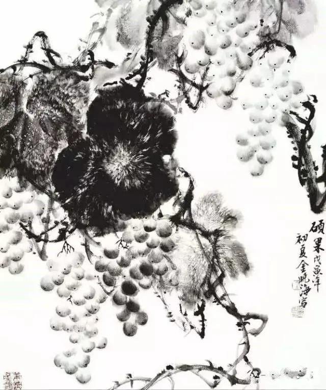 青年时期的金晓海,凭藉克绍箕裘之精神,奋发意气,凡梅兰竹菊,芭蕉葡萄,荷芋瓜果,山石花鸟之属无不倾心摹写,探根究源,同时体悟西画光影色彩构成之要素,广撷博探,试图达绘创图式多笔墨元素的融洽,主观意趣的渗透。笔耕墨耘,历经数十载陶冶熔炼,于花鸟界崭露头角。