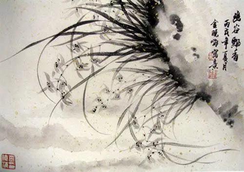 除了创作,他饱读绘画理论,还成了陆老家中的常客。经多年修炼,金晓海笔下的兰花如津人操舟,一笔出之,浓淡枯涩,提按顿 挫跃然于纸,兰叶看似双钩,却又非双钩,笔墨浑穆葱郁。