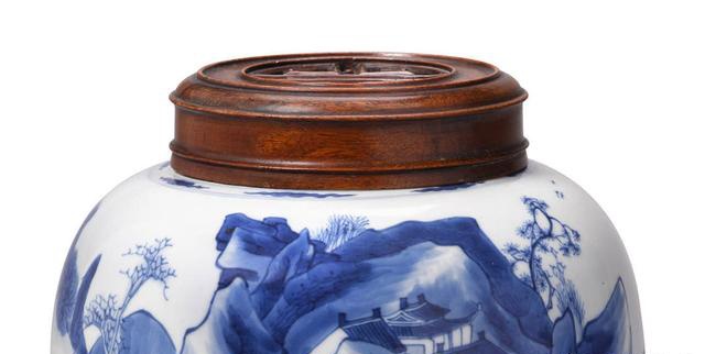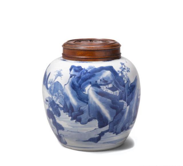接下来玉斋君试举几例。首先是这件十八世纪的青花罐子,青花是典型的清朝青花釉料,发色蓝而细腻,青花分水也还是可以的,在山的表现上稍微差了点,罐口配了一个红木的雕刻盖子,最后成交价格仅4825美金,合人民币33000左右,这个价格在国内也就能买到一个中青年大师的手绘作品,堪称一漏。