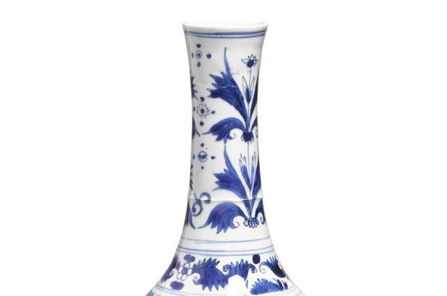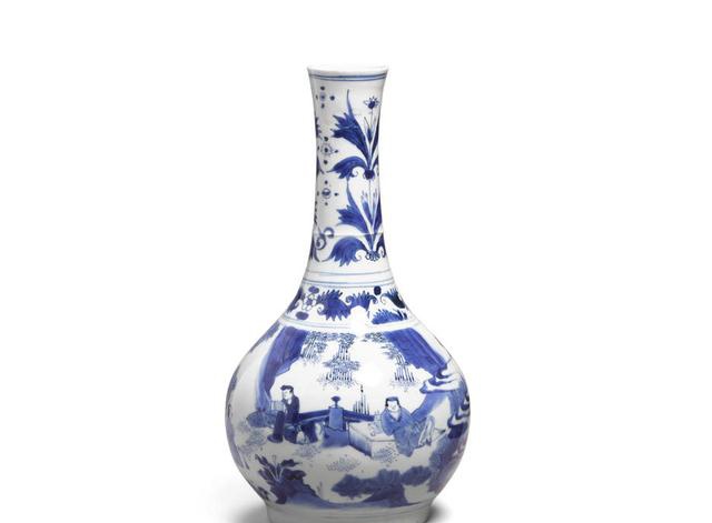另一个是这件青花人物长颈胆式瓶,青花风格是清朝17世纪的民窑作品,民窑的釉料不是很好,发色自然不那么出色,人物描绘上也不怎么出彩,最后成交价6950美元,合人民币48000元,这个价格对于一件17世纪的青花瓶子来说还是很有吸引力的。