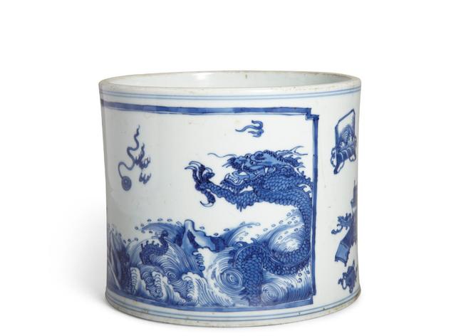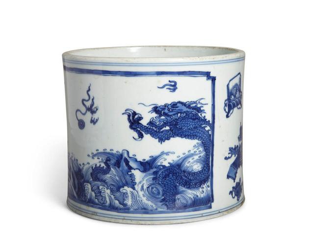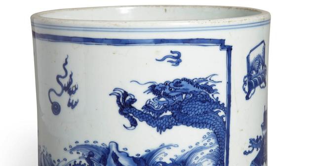 清康熙 青花海水龙纹笔筒