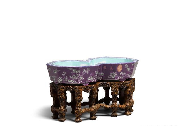 民国 仿大雅斋双八角形紫地花卉纹盆