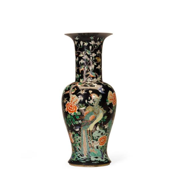 19世纪 黑地画珐琅百鸟朝凤凤尾瓶