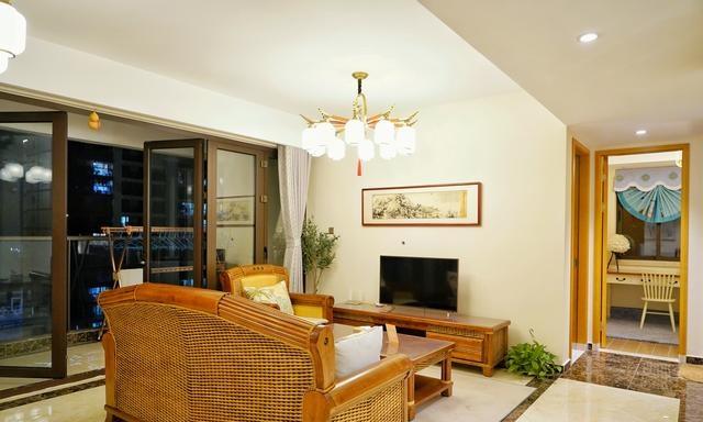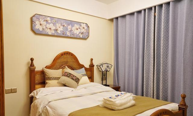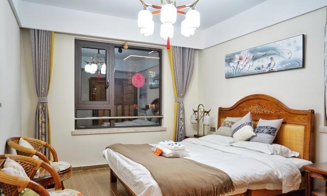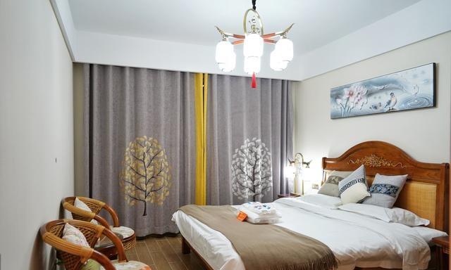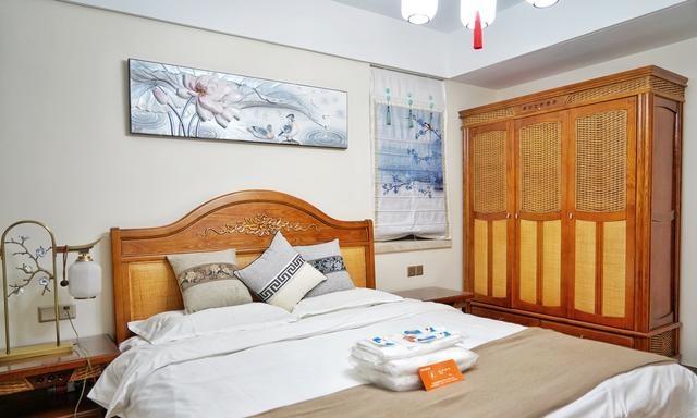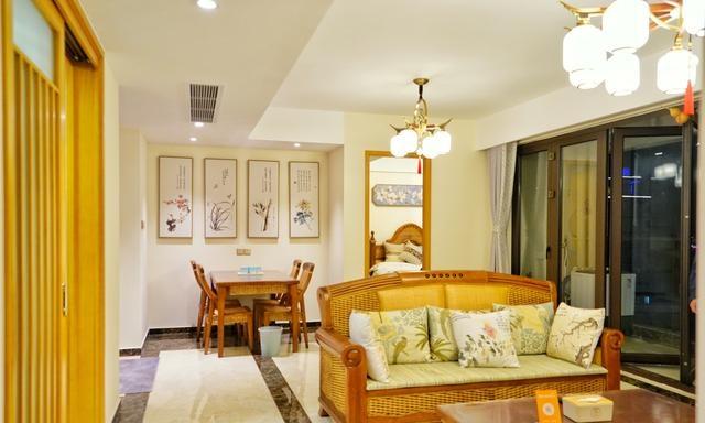 入住之前,房东加了我微信,确认了住宿信息。下了飞机,仅有十公里的车程便到了小区。用小程序开锁进屋,爸妈开心极了。这是一套新中式三居室,室内每个房间不同风格,但调性又非常统一。落地窗,超大阳台,房屋采光和通风都非常好。客厅里有茶具,阳台上有晾衣架、滚筒洗衣机,开放式厨房里冰箱、炊具齐全。途家民宿统一管理,洗漱用品都是高品质一次性的。