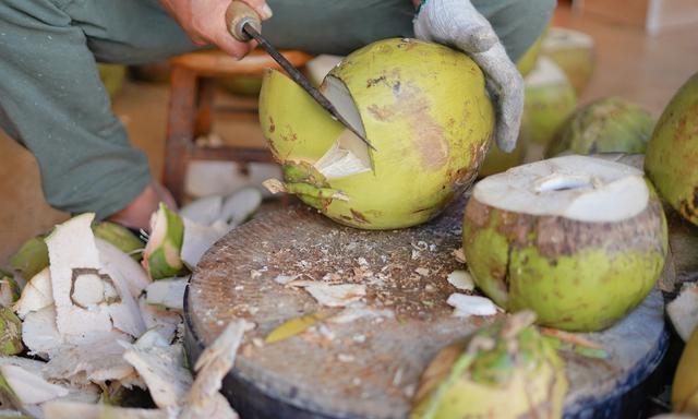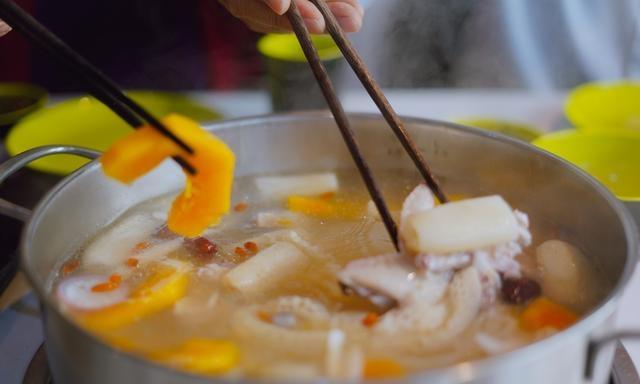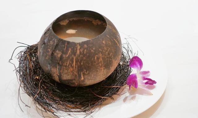 三个椰子做锅底,师傅在门口现砍。椰子来自东郊天然椰林。海南椰子半文昌,文昌椰子半东郊,东郊椰林是全球最大的天然椰林。这里昼夜温差大,优越的生长条件,促使椰汁会更加的清甜甘爽。这里的椰子汁被当地农民称为天水,清甜甘美,含有多种有益元素。据说,常饮用可以使人返老还童。这些嗲嗲的椰子在东郊海边吸纳着日月精华,矫健的椰农爬上椰树手起刀落,枝条的切面还泛着水汽,椰子已经一路颠簸来到了我们的餐桌上。