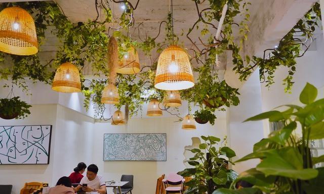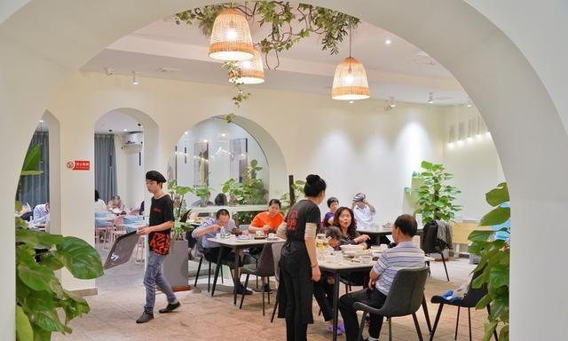 从椰梦长廊的婚纱摄影集中地段沿着海岸线像市区漫步,大约两公里左右便到了市区里的机场路。一座隐居闹市的海南私房菜馆引起了我的兴趣。琼乡阁,在黄昏中用美食打造了一方精神田园。简约而清新的装修风格,让人感觉很清新。半圆形的隔断,既相对独立又自成风景。吊篮与鸟笼的灯饰带来满满的田园ins风。来得早,还好有空位,据说来得晚了这家网红店也是需要排队等候的。