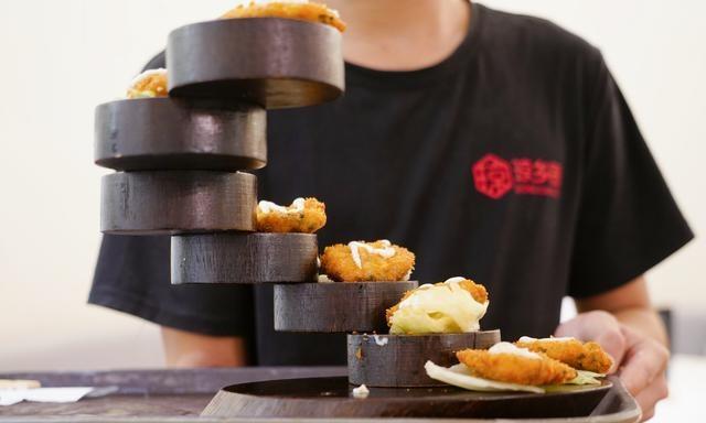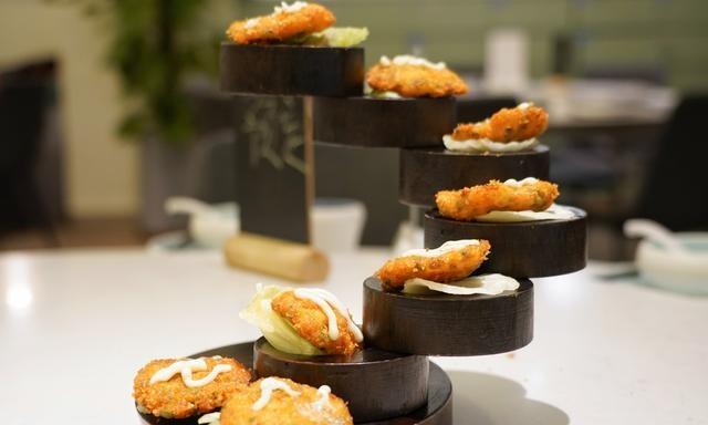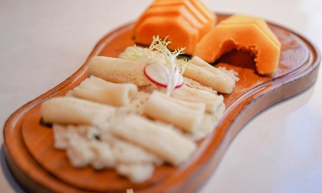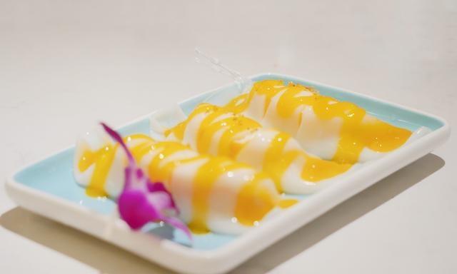 妈妈很喜欢桂花芒果卷,这道菜一端上桌让人就忍不住拍照,摆盘非常精致。芒果卷外是一层脆滑的双奶外皮,淋上桂花芒果酱,嫩黄的颜色可爱极了。