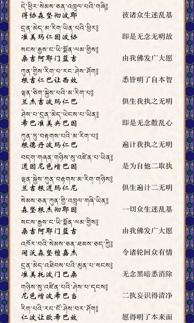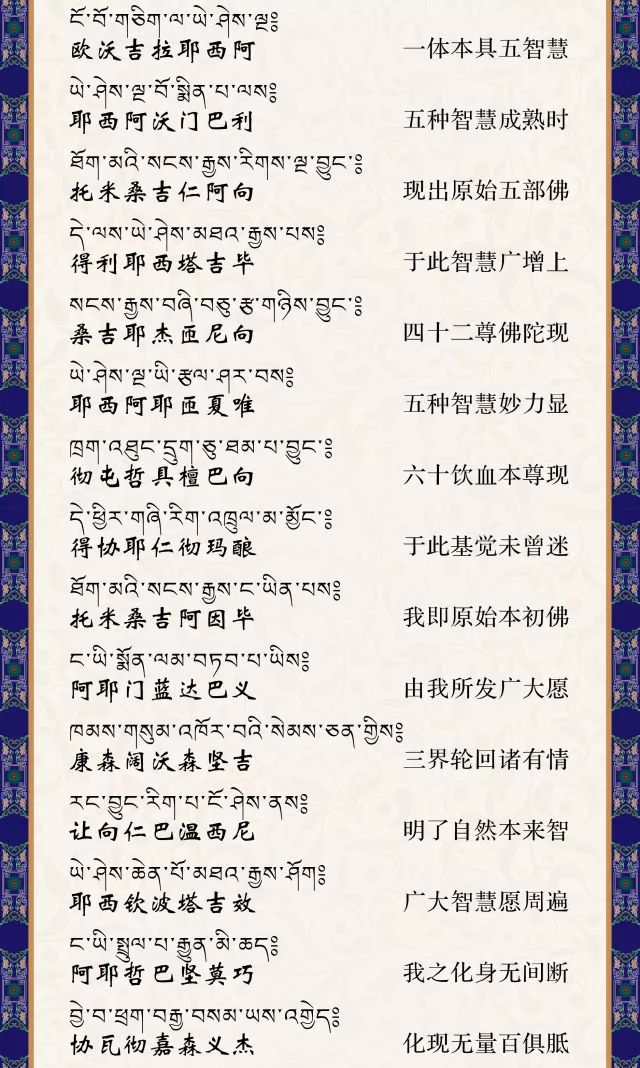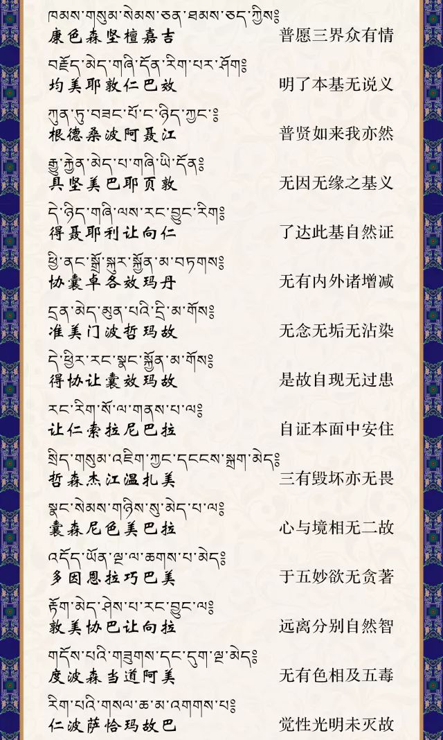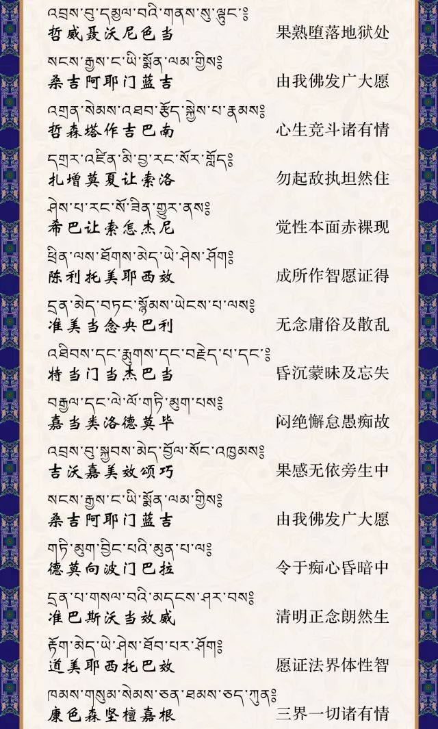 日食月食地震雷鸣冬至夏至春分秋分二十四节气,请念诵此发愿文。如果我们读诵这个祈祷词,会产生很大的威力。当我们以一种很清净没有染的心来读诵的时候,一切众生都会得到觉悟。在西藏,这个祈祷词是使你不得不开悟的祈祷词。尤其在不吉祥、遇动、大灾大难或高山风口、江海岸边、众生聚集处念颂大愿文,极其殊胜,无量功德,众生听闻后三生之内即可成佛。