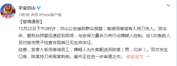 新京报快讯 据武汉市洪山区公安分局消息,12月22日下午2时许,洪山公安接到群众报警:南湖佰港城有人持刀伤人。派出所、警务站民警迅速赶到现场,与安保力量合力将行凶嫌疑人控制。经120急救人员对受伤男子检查发现其已无生命体征。