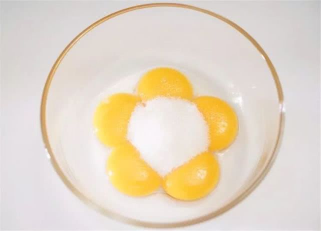 3、制作蛋黄糊,蛋黄中加入25g细砂糖。