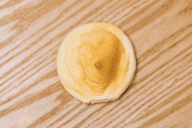 18、烤好的蛋糕出炉后在桌上摔一下,震出内部气泡后,放置于网架上晾凉。