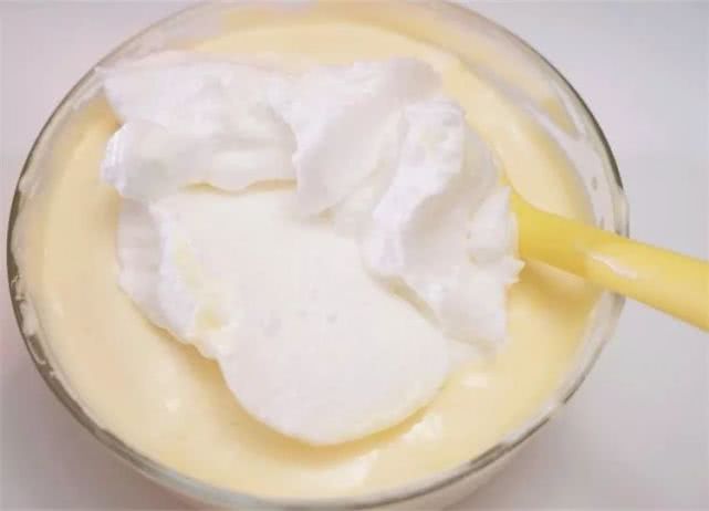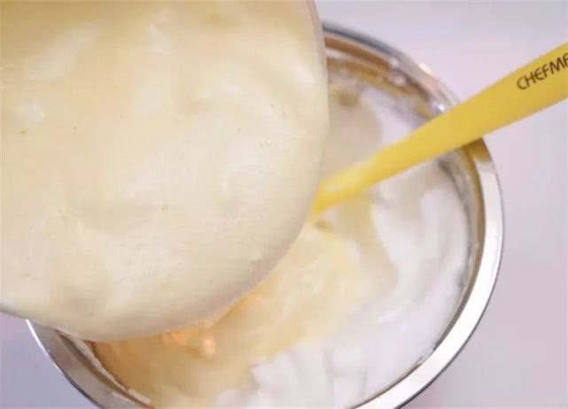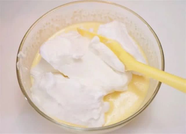 13、将拌匀的蛋黄糊一次性倒回到剩余的1/3蛋白霜盆中,迅速拌匀。