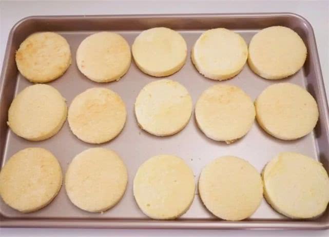 19、晾凉的蛋糕片脱模后,用圆形切模一个个摁出来(我用的是饺子片的切模,按大小组合后可以做8个左右的肉松小贝)。