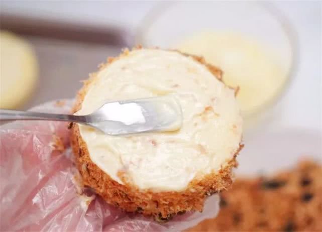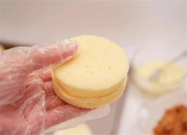 20、开始组装肉松小贝(这个步骤最好戴上一次性手套操作):取一片蛋糕片抹上沙拉酱。