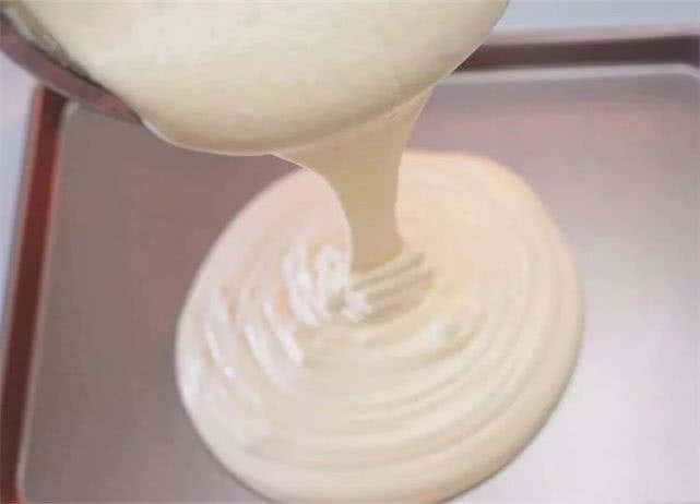 14、将拌匀的蛋糕糊从20cm左右的高度倒入烤盘。