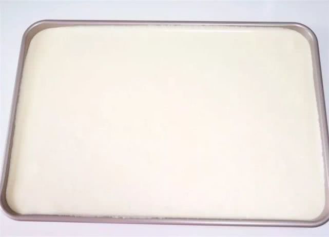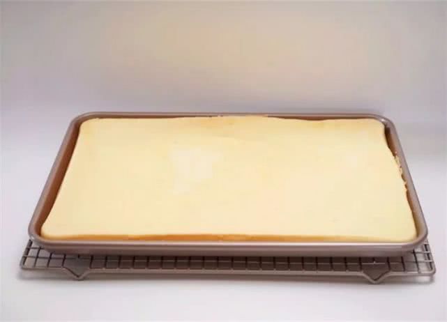 15、晃动下烤盘,使蛋糕糊均匀地平铺在烤盘里,然后端起烤盘在桌上震两下,震出气泡。