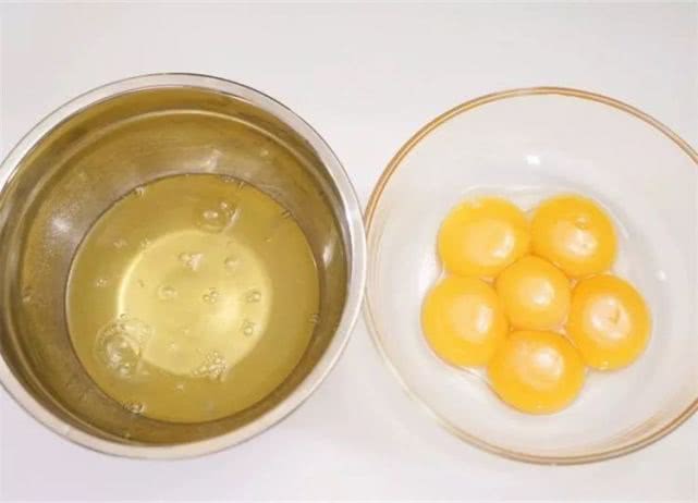 2、将蛋黄和蛋清分离出来,分别装在两个干净的无油无水的盆中。