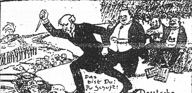 在当时,协约国将德国宣传为专制主义和军国主义,并宣传其对世界和人类有危害。尽管英法本身也是这样,在第一次世界大战中,并不如同后来第二次世界大战那样泾渭分明。但是德国内部的天主教徒、社民党人与犹太人相信了这种宣传,再加上国内的社会矛盾——民众相信了英法的宣传和保证,以及美国的十四点和平原则。