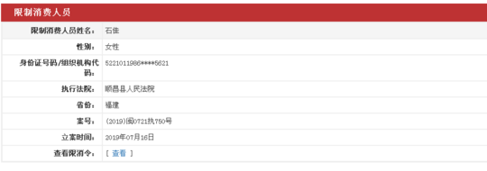 12月21日,顺昌县人民法院公布最新一期失信被执行人名单,杜彬与石佳在列,且具有履行能力而拒不履行生效法律文书确定义务,目前,法院已经将石佳列为限制高消费人员,发出了“限消令”。