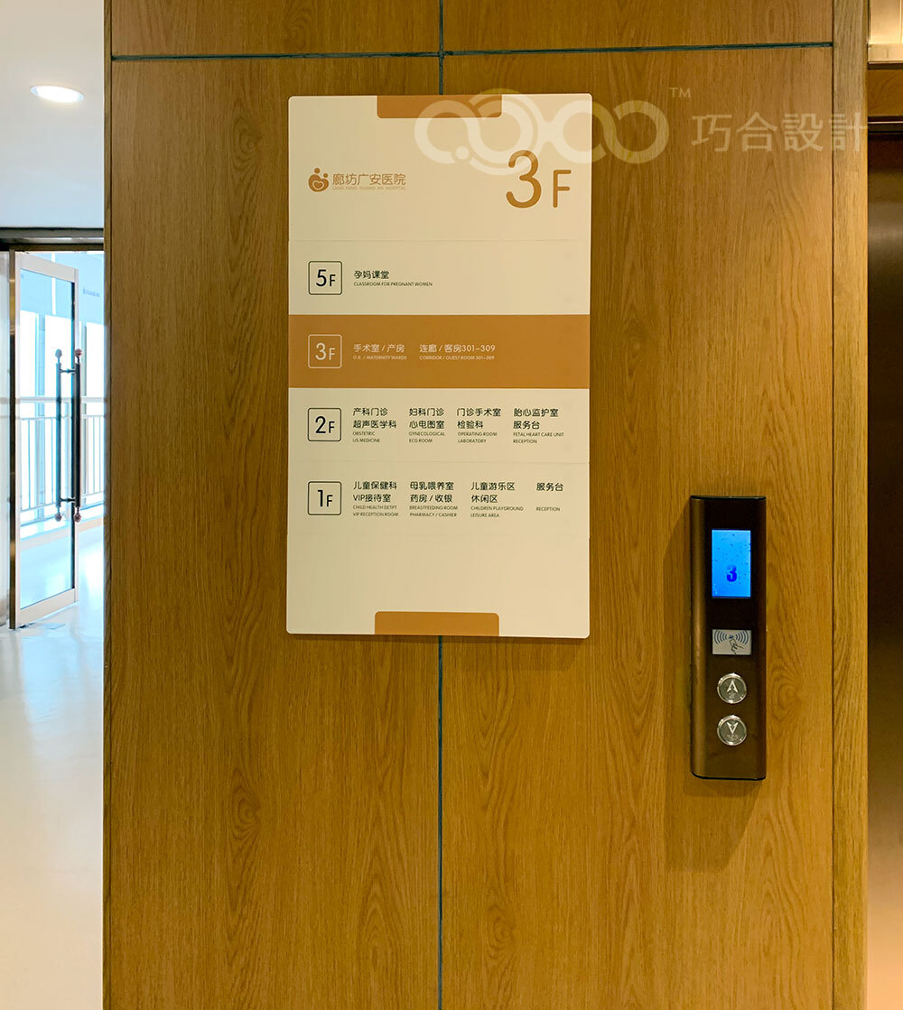 此外,医院室内的导视标牌设计也在呼应空间的整体氛围,呈现出高度功能化但不失灵活的特点——电梯厅导视牌运用了两种色彩,其中暖橙色和背景木饰面色系相近, 在 白色的映衬下清爽又醒目 。